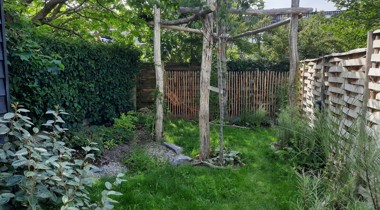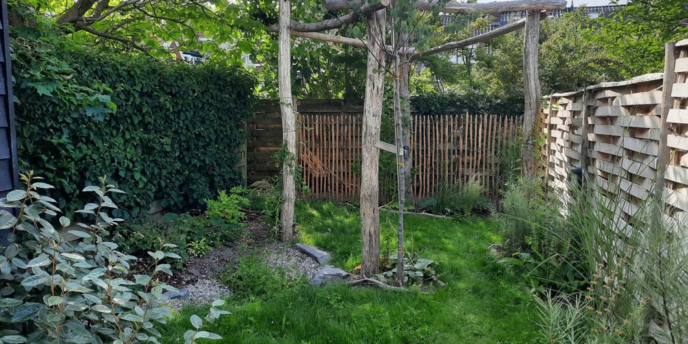 De kenmerkende stijl van hovenier Edith Rooseboom komt naar voren in de knusse natuurtuin, die ze heeft ontworpen. Al wandelend door de tuin ontdek je allerlei hoekjes en plekjes, die zorgen voor een speelse inrichting en beleving. Bij haar ontwerp heeft Edith de zeven stappen van het Natuur voor Elkaar-hovenierslabel gevolgd.